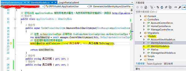 GenerateUserIdentityAsync方法中添加 userIdentity.AddClaim(new Claim("員工名稱", this.員工名稱.ToString()));