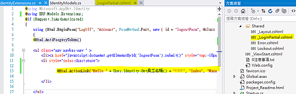 @Html.ActionLink("Hello " + User.Identity.Get員工名稱() + "!!!!", "Index", "Manage", routeValues: null, htmlAttributes: new { title = "Manage" ,style= "top:-10px;color:chartreuse" })