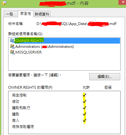 存取被拒 直接對資料庫按右鍵 修改安全性權限 (mdf,log)