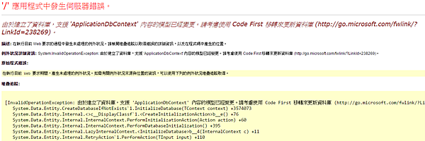 由於建立了資料庫,支援 'ApplicationDbContext' 內容的模型已經變更。請考慮使用 Code First 移轉來更新資料庫 (http://go.microsoft.com/fwlink/?LinkId=238269)。